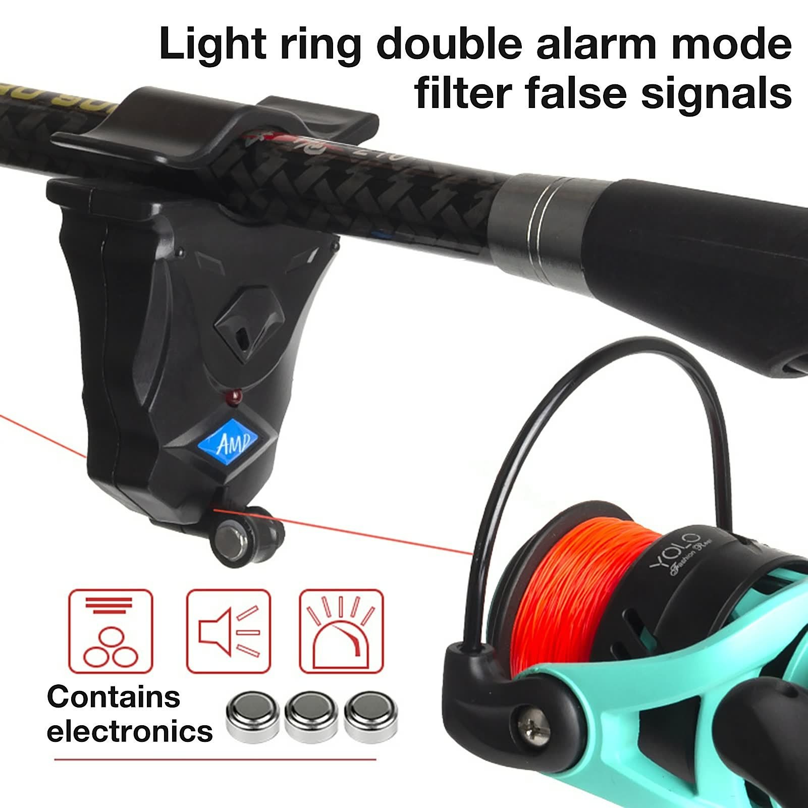 Fishing Bite Sound Alarm Fishing Rod Clipped Alert Bell Alert Clip-On Fishing Rod Pole Easily Installed Fishing AccessoriesFeature:1.Designed for Fishing: Sound and light alarm device is used for fishing. When fish bites bait and runs;  the alarm clock will notify you;  so you will not miss the big fish.2.Easy to Carry: Small and exquisite;  easy to carry and install;  just hang on the pole;  and then wrap the fishing line on the bite hook alarm.3.Good for Night Fishing: Suitable for night fishing;  and the flash can be seen at 150 meters;  you can use this product at any time.4.Clear Sound: False signals can be filtered;  the alarm sound is loud and clear;  the volume can reach nearly 80 decibels;  can be heard clearly from a distance.5.No Damage: Not damage your fishing line or any part of the fishing rod;  can be easily clipped fishing rod without trouble.Specification:Material: ABS;  rubberSize: about 7*5.5cm/2.75*2.16inBattery: 3*button batterySound decibel: 80 decibelsFeatures: sound and light dual alarmHow to use: Clamp the alarm on the fishing rod;  clip the wire and turn on the alarm switch device;  then you can fishPacking List:1 * Fish Bite Alarm